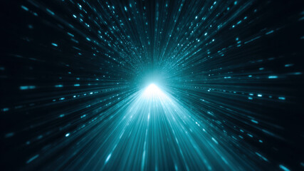 Futuristic tunnel light, blue neon glow, digital beam, abstract pyramid portal, data stream, technology flow cyberspace carrying information and datum toward bright vanishing point with dynamic