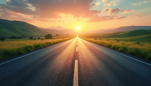 Long straight asphalt road towards sunset over green hills. Empty deserted highway vanishing point view. Sunny scenery. Car travel. Road trip adventure wallpaper.