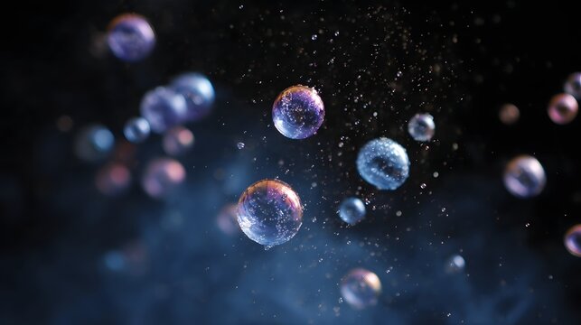 Close up of iridescent bubbles floating and scattering in a dark abstract environment with subtle light and particles