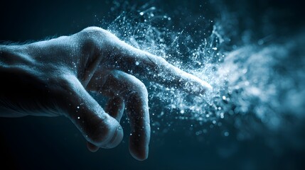 Human hand interacting with luminous particles and smoke effects.