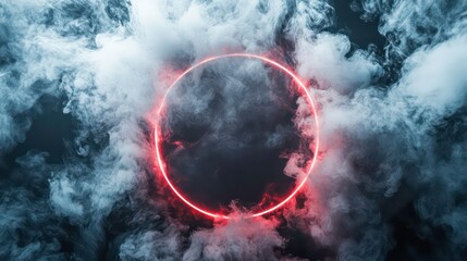 Glowing neon mountain ridge bathing misty valley with blue fog and pink highlights