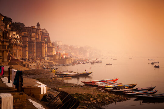 early morning view of famous ghats of varanasi where wooden boats lined up