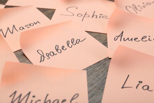 Paper stickers with different names on wooden table, closeup. Choosing baby's name