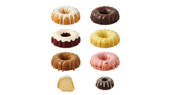 Bundt cake set including chocolate, vanilla, strawberry, lemon, and caramel glaze variants isolated. Assorted dessert and bakery collection.