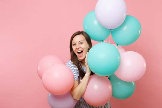 Portrait of joyful young happy woman with opened mouth in blue dress holding colorful air balloons isolated on bright trending pink background. Birthday holiday party, people sincere emotions concept.