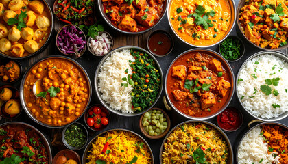 インド料理が並ぶビュッフェ形式のテーブルで多彩なバイキングメニューを楽しむ構図