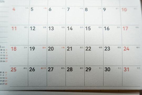 A close-up view of a calendar page displaying various dates and numbers, depicting a monthly calendar layout. This image captures the essence of planning and organization.