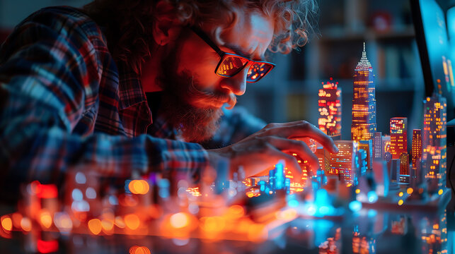 Architects collaborate on floor plan with digital design icons