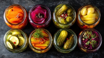 Eight jars hold various types of pickled vegetables including carrots cucumbers and beets. Bright colors contrast with the dark surface showing a home food preservation activity.