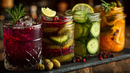 Various types of pickled vegetables arranged in jars on a wooden surface