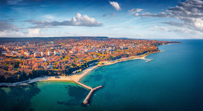 Beautiful cityscape over Varna city, Bulgaria. Panoramic aerial view.