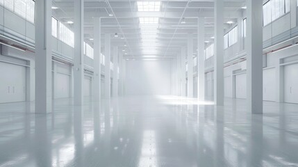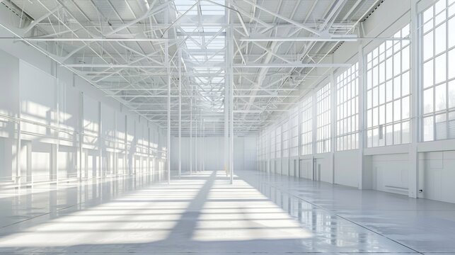 Empty white warehouse interior with clean, open space and a pristine white background, emphasizing the vast, uncluttered area