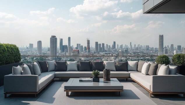 Rooftop lounge area with city view.  Modern sectional sofa set,  coffee table, and lush greenery, overlooking a vast cityscape