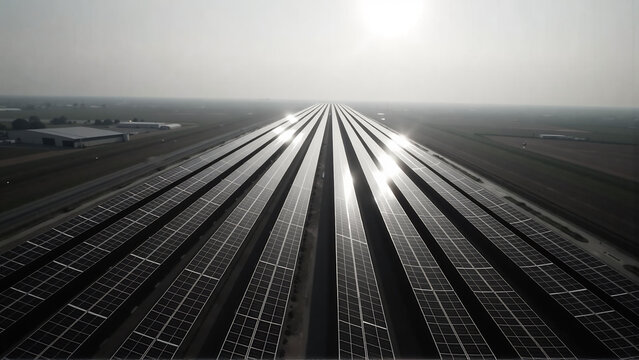 Rows of blue solar panels stretch to horizon at sunset. Aerial view shows large renewable energy farm absorbing sunlight. Clean electricity generation in vast photovoltaic field.