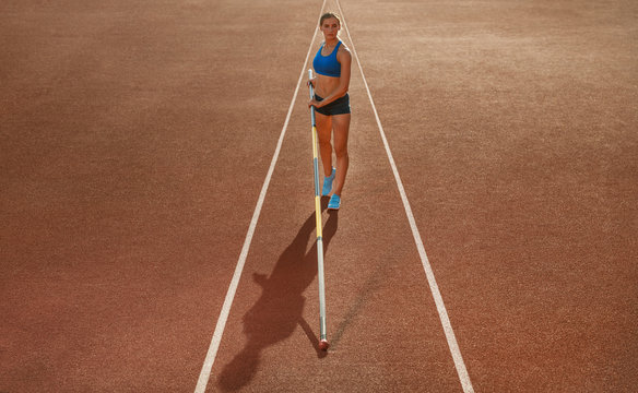 Professional female pole vaulter training at the stadium in sunny day. Fit female model practicing in high jumps outdoors. Concept of sport, activity, healthy lifestyle, action, movement, motion.