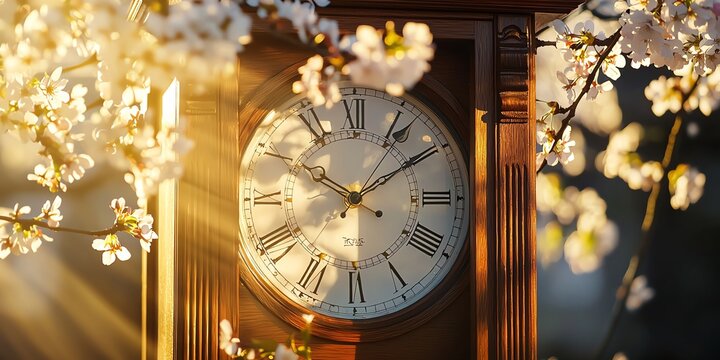 Classic grandfather clock silhouette with double exposure of blooming cherry blossoms inside, soft dappled sunlight
