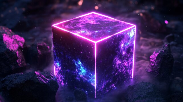 Glowing neon cube floating in purple nebula revealing triangular hatch and mini cubes