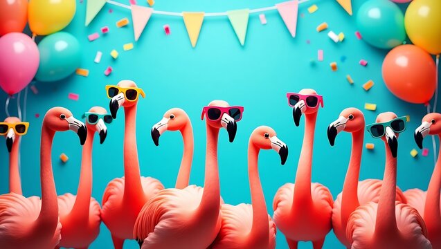 3D rendering of a summer beach background with the sun, sunglasses, and an inflatable flamingo on the sand.