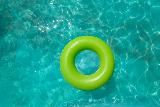 ubber ring, Rubber in swimming pool, colourful rubber ring on water blue surfaces, Safety for kids in swimming pool, Vacation time concept.colorfule  ring floating in refreshing blue swimming pool.