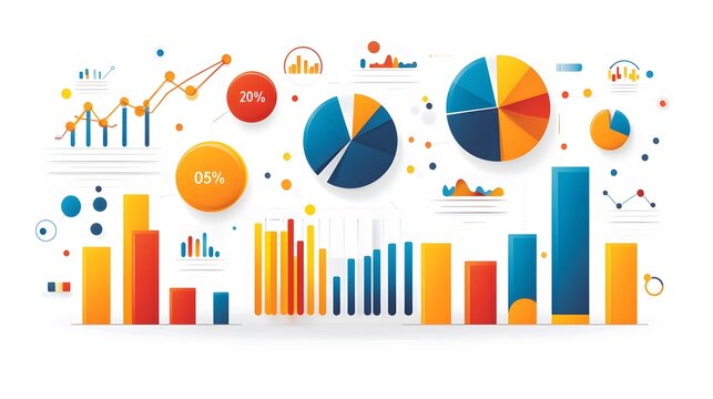 A vector business analysis graph, featuring a combination of pie charts and bar graphs on a minimalist white background, designed for data visualization.