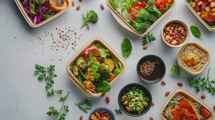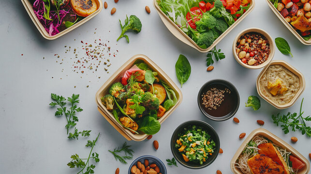 A variety of vegan dishes delivered in a neatly arranged package. Dynamic and dramatic composition, with cope space
