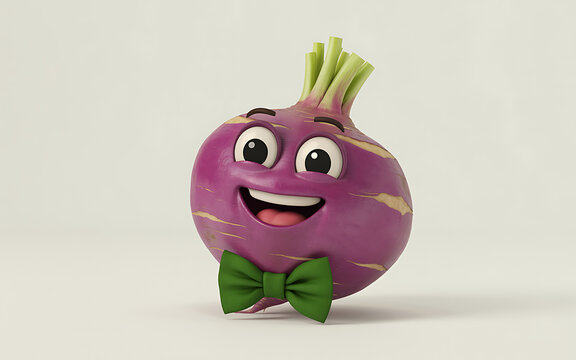 A cheerful cartoon beetroot character with a bow tie