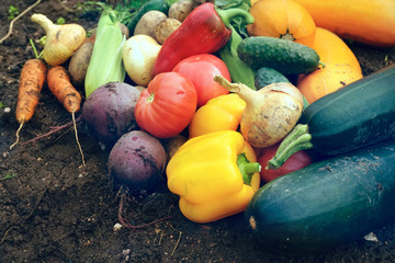 A set of fresh vegetables on the background of the soil close-up. Pile of Vegetables on ground - vegetable marrow, carrots, onions, peppers, cucumber, tomato, corn, beets, potatoes.