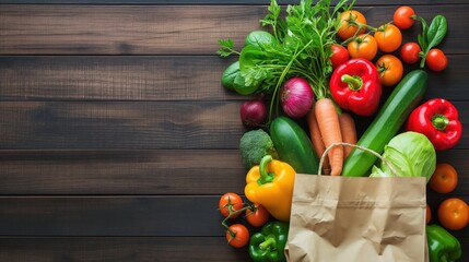 Fresh Delivery of Healthy Vegan and Vegetarian Food in Paper Bag on Wooden Background with Copy Space.