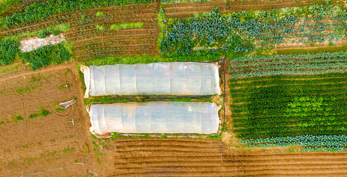 Aerial drone photography of green vegetable rows and white greenhouses in a fertile valley showing the intensive farming activities in the rural region of Turkey