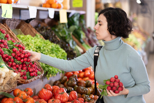 Woman chooses fresh radishes near a vegetable counter in a supermarket. European woman buys seasonal vegetables at the market