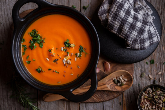 Hot pumpkin soup in cooking pot on dark background