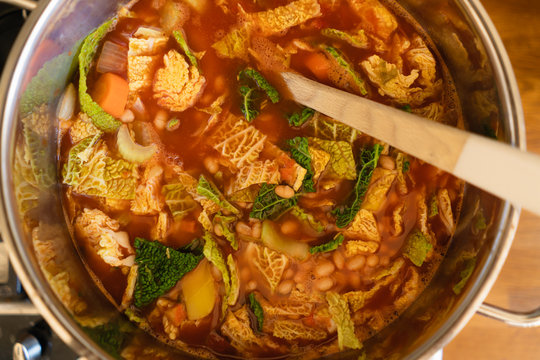Pot with homemade Minestrone soup, a traditional Italian one pot dish made of tomatoes, carrots, onions, savoy cabbage, cannellini beans, celery and potatoes for a healthy vegetarian low carb diet