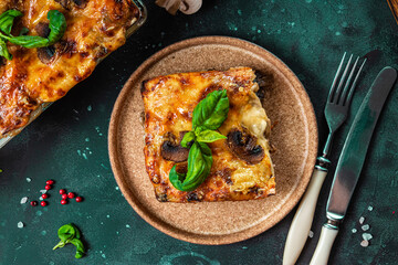 A piece of vegetarian lasagna with mushrooms, tomatoes and basil, top view