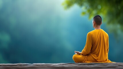 Buddhist Monk Meditating on Cliff Edge at Sunset.