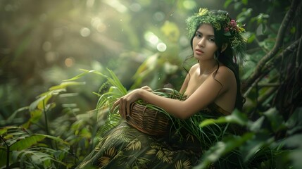 Mysterious woman amidst tropical foliage adventure in the jungle setting