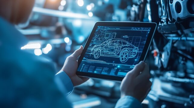 A mechanic uses a tablet with futuristic digital interfaces to analyze car eco data in a dimly lit garage.