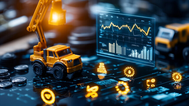 Miniature Construction Vehicles on Dark Surface with Digital Financial Analysis and Graphs Elements