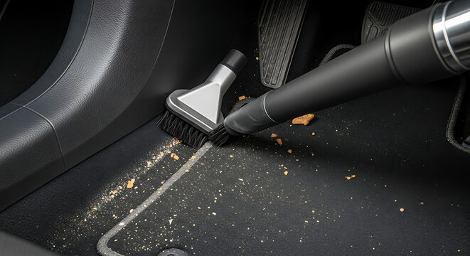 Car vacuum cleaner cleaning dust and dirt from vehicle floor mat detailing auto interior with brush nozzle