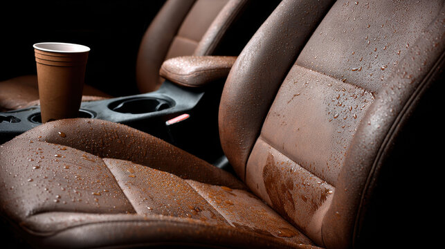Wet car seats and spilled coffee in a vehicle interior during an evening drive