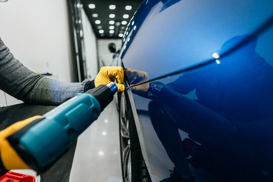 Professional vehicle detailing service in a modern car workshop. Car workshop specialist putting vinyl foil or film on car. Worker using steam pistol for better wrapping and tightening foil edges.