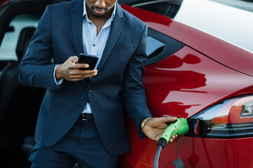 Ecofriendly innovation: driver connecting electric vehicle to public charging port