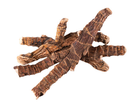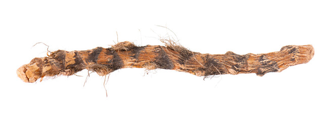 Calamus root isolated on white background. Sweet flag, sway or muskrat root, vasambu. Dry root of Acorus calamus.