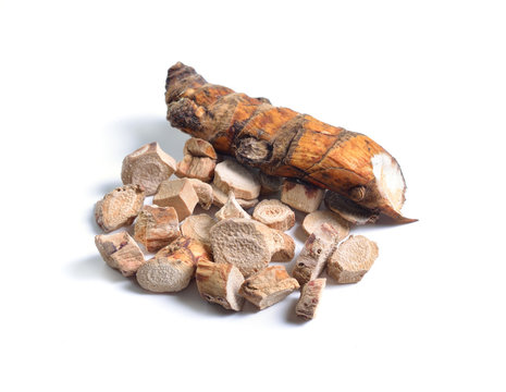 Dried medicinal herbs raw materials isolated on white. Root of Acorus calamus