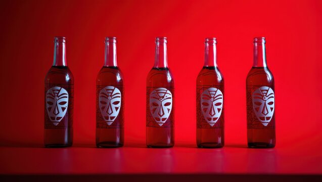 Five bottles with anonymous mask labels on a red background in studio