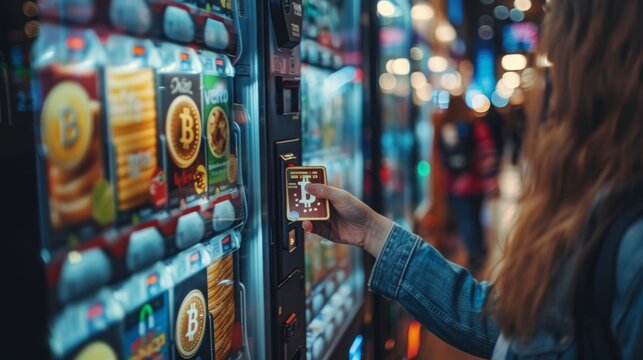 Close up view of woman paying for purchase at snack vending machine using smartphone. Contactless payment theme.