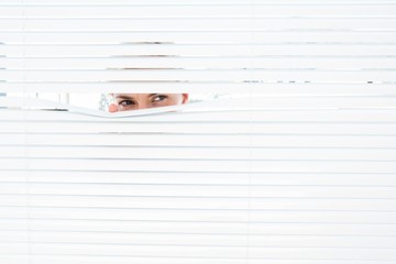 Curious blonde woman looking through venetian blind