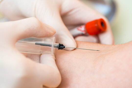 A healthcare professional collects a blood sample from a patient's arm using a syringe in a sterile environment.
