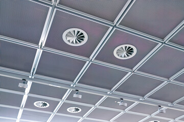 Ceiling of white tiles and ventilation pipes, lights, smoke detectors