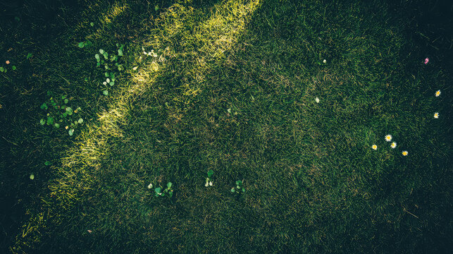 Top view bright green grass field and flower background