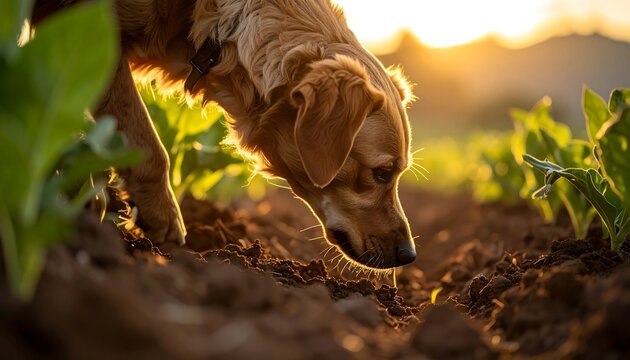 Scenic view of a lush, verdant agricultural field at sunset, with rolling hills and a vibrant sky in the background.